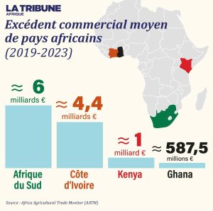 En tête, l’Afrique du Sud affiche un excédent commercial moyen d’environ 6 milliards d’euros, loin devant la Côte d’Ivoire (≈ 4,4 milliards €), le Kenya (≈ 1 milliard €) et le Ghana (≈ 587,5 millions €).