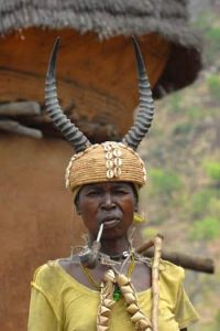 Les Batammariba possèdent une organisation sociale et rituelle riches qu’ils considèrent comme le fondement de leur culture. Au lieu de fondation de la communauté se trouvent les centres rituels, composés du cimetière, de la grande maison d’initiation des jeunes et du sanctuaire du Serpent titulaire du clan. C’est d’ailleurs à l’occasion du rituel initiatique le dikuntri que la coiffe serti de cauris, cornes d’antilopes est de sortie. Ce rituel prend différentes appellations lorsqu’il s’agit des filles, le dikuntri. et les garçons, le difwani.