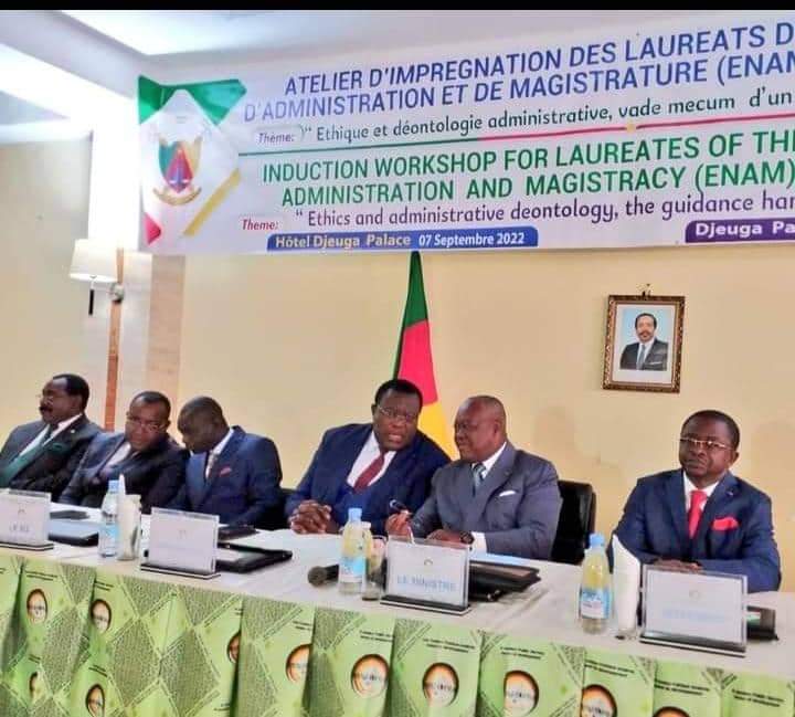 Un atelier d’imprégnation a été organisé ce mercredi 7 septembre 2022 par le Ministère de la Fonction Publique et de la Réforme Administrative (Minfopra) à l’endroit des lauréats de l’École Nationale d’administration et de Magistrature (ENAM), promotion 2019-2021. Ce séminaire c’est tenu en présence du Ministre de la fonction publique,Joseph Le, le Ministre délégué auprès de la Justice Jean De Dieu Momo, le directeur général de L’ENAM ,SOUMBOU ANGOULA Bertrand Pierre et bien d’autres personnalités .