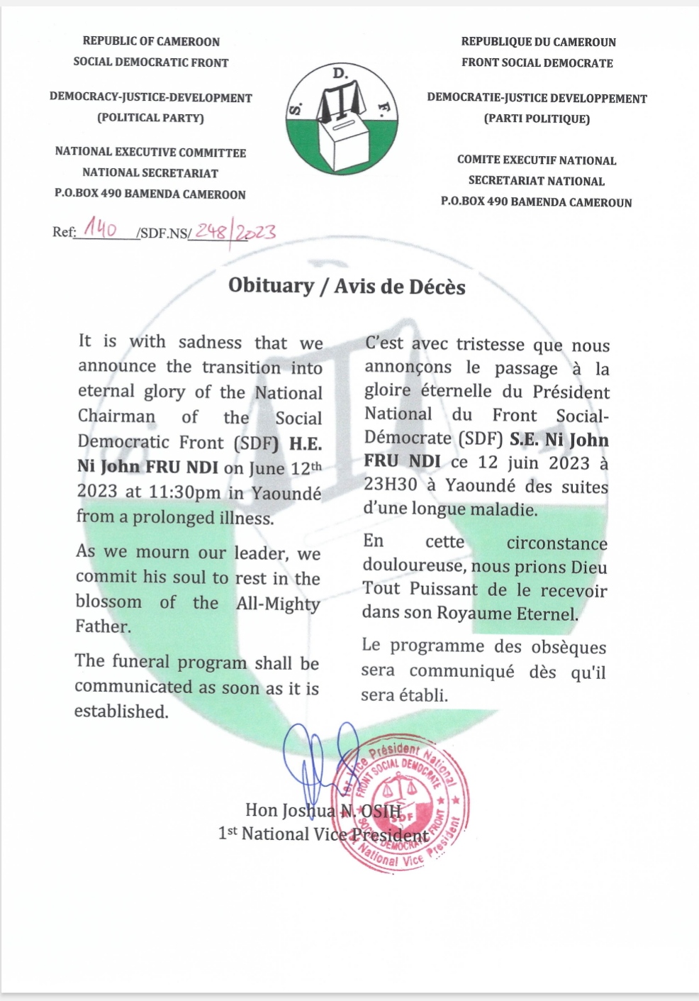 Ci-dessous l’avis de décès de Ni John Fru Ndi publié par le SDF :