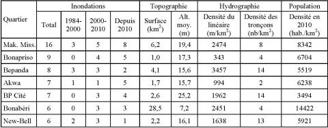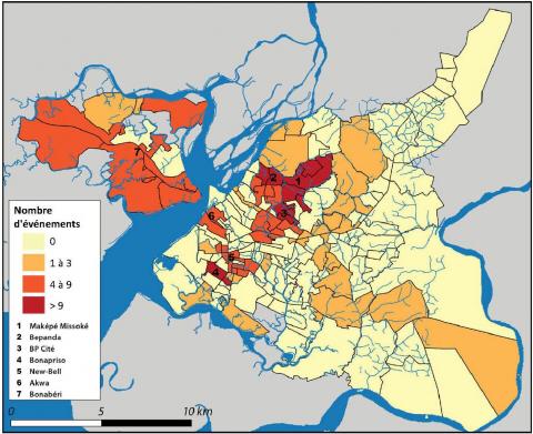 Le nombre de quartiers inondés est passé de 29 sur la période 1984-2000 (17 ans) à 81 sur la période 2001-2010 (10 ans) puis à 84 après 2010 (7 ans), alors que le nombre total de quartiers a seulement doublé entre 1984 (98) et 2017 (196). Les inondations de la période 1984-2000 se répartissent essentiellement dans le centre historique de la ville (Akwa, Bepanda et New-Bell). La période 2000-2010 marque un changement, les inondations affectant à présent des quartiers périphériques du centre, en particulier Maképé Missoké, BP Cité et Bonapriso. Cette situation reste quasiment inchangée depuis 2010, les principales zones inondées étant en grande partie constituées de quartiers à la densification récente En effet, les quartiers du centre de la ville, où les inondations sont anciennes mais toujours fréquentes, tels que New Bell ou Akwa, souffrent d’une densification urbaine excessive qui conduit les populations à s’installer sur les voies d’évacuation des eaux.
