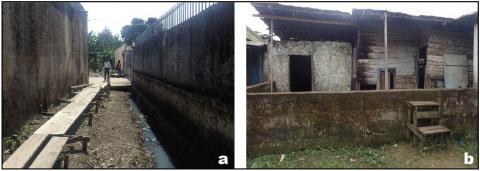a : passerelle en bois à proximité des drains à Bonapriso. b : muret pour limiter l’entrée des eaux dans les maisons à Maképé Missoké.????????
