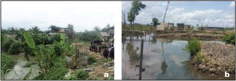 a : levées de berges constitués de gravats et de divers détritus à Maképé Missoké. b : remblais en zone de mangrove au Bois des Singes.????????