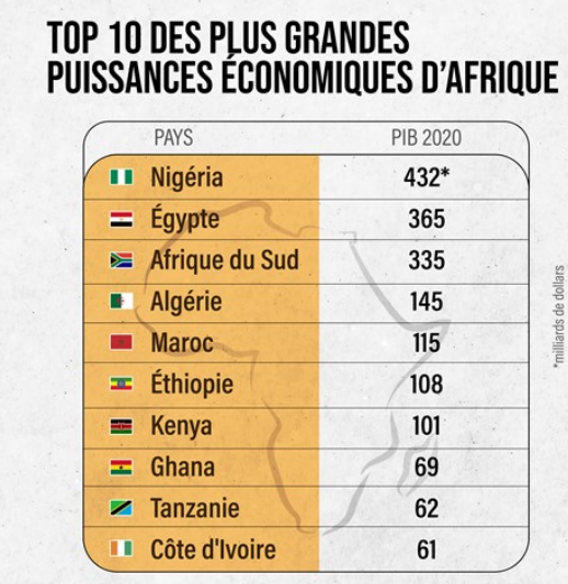 Après 2018, la Côte d’Ivoire réintègre le top 10 des plus grandes puissances économiques d’Afrique en 2020 en se positionnant au 10ème rang avec un PIB de 61,35 milliards de dollars, soit 36 124,7 milliards FCFA, et le Cameroun reprend la 14 ème place avec un PIB de plus de 40 milliards $, soit exactement 23 586 Milliards FCFA, selon les récentes données de la Banque mondiale.