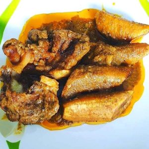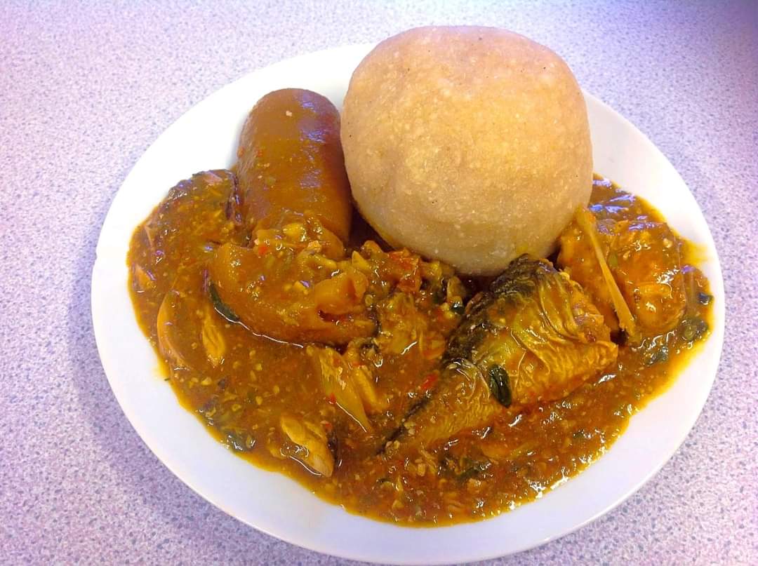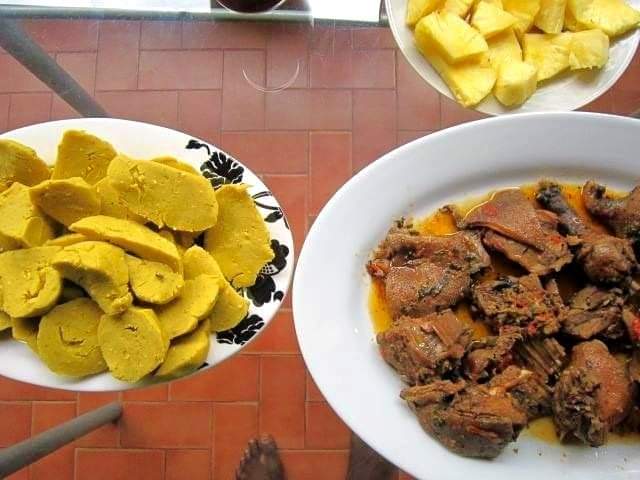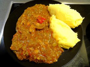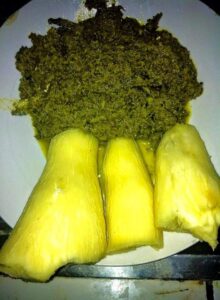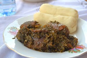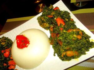 – Fufu, which is made from boiling starchy ingredients is common. The fufu is served with a variety of soups or sauces made from vegetables and fruits such as cassava leaves, bitter leaves, cocoyam leaves, tomatoes, okro, melon seeds, peanuts etc.