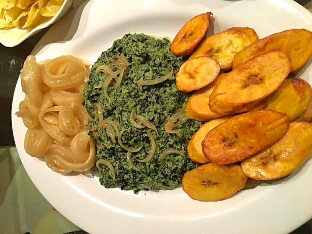 – Folong aux arachides. Légume vert, le folong est riche en vitamine A et B2. C’est un épinard qui cuisiné avec l’arachide flatte le goût. C’est un plat végétarien où peut être incorporée la viande. Il s’accompagne de divers compléments, manioc, plantain, macabo, pour ne citer que ceux-là.