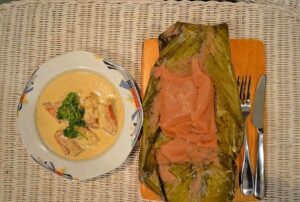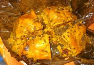 – Le Ndomba, viande ou poisson cuit(e) à l’étouffée avec des épices dans des feuilles de bananier spécialité de la région forestière du centre et du sud.