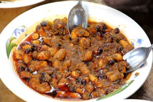 – Fôss. Les chenilles sont des larves qui sont très souvent présentes dans les troncs d’arbres comme le palmier. Il existe une multitude de types de chenilles : des chenilles noires, des vers blancs encore appelés « Fôss » et d’autres ; certaines ont des têtes rouges, d’autres noires.