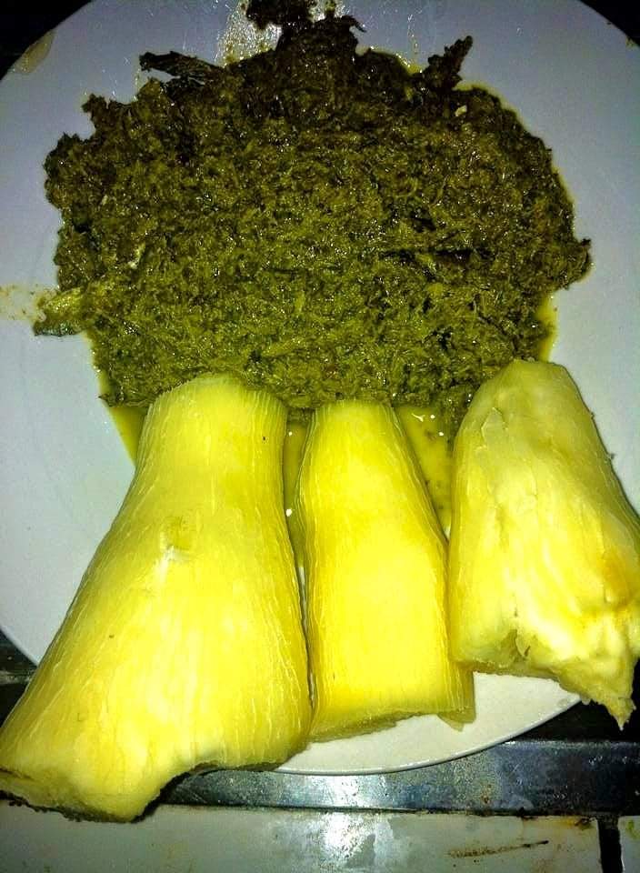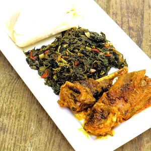 – Eru is a meal that originates from the Southwest region of Cameroon and today it is eaten and enjoyed by so many Cameroonians in all the ten regions. Eru is a mixture of okok vegetables and water leaf a sort of spinach with small leaves. It is also accompanied by beef, cow skin, smoked fish and crayfish.