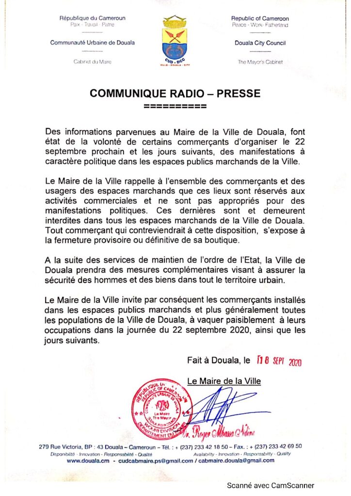 Le Maire de la Ville de Douala rappelle aux Commerçants et aux usagers des espaces marchands que ces lieux sont réservés exclusivement aux activités Commerciales et non politiques.