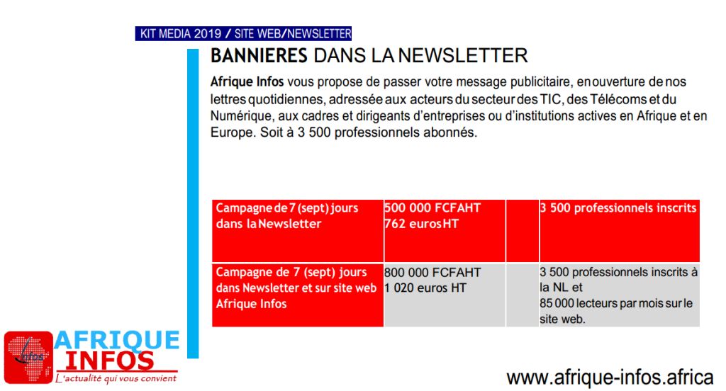Vous avez besoin d’une offre publicitaire pour faire connaître vos produits ou services, Afrique Infos vous permet de choisir parmi celle que propose sa plateforme, la meilleure qui puisse vous satisfaire.