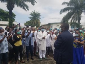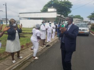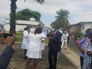 Il a reçu un accueil chaleureux et standing ovation de la part des Malades présent et du personnel de L’hôpital Laquintinie ce matin à son arrivée, ému, il a humblement remercié les uns et les autres et a promis plaidé et agir pour l’amélioration continue de leurs conditions de travail et des projets inachevés de L’hôpital Laquintinie<<Continuez à donner le meilleur de vous aux malades et malgré la pandémie de la Covid-19 qui a fait chuter le taux de fréquentation…ne perdez pas les bons reflexes et habitudes acquis>>.