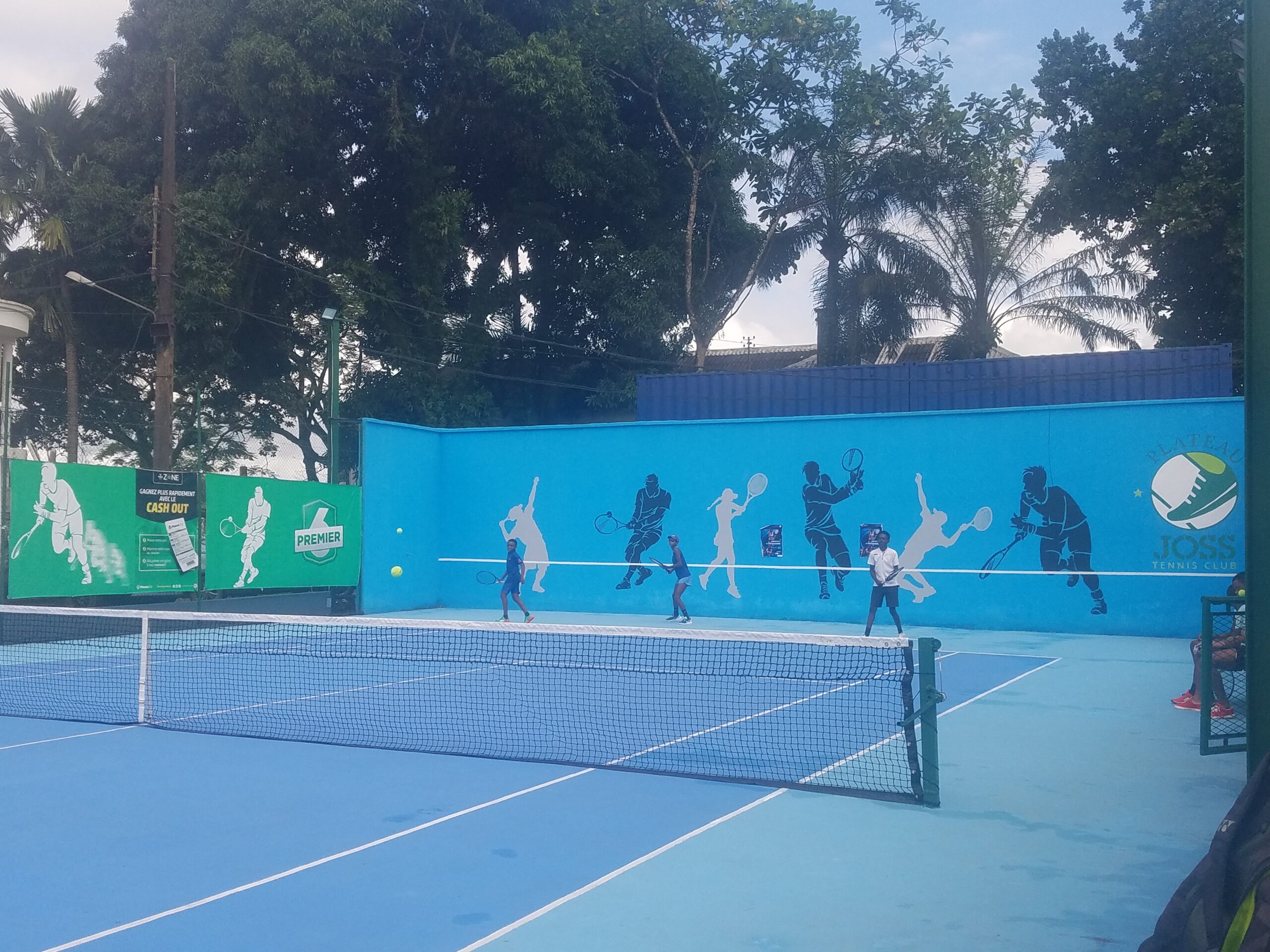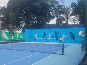 Les travaux qui ont consisté à la remise à niveau du court principal de tennis, l’aménagement des Toilettes pour femmes et pour hommes, ainsi que l’incorporation d’un espace bar et restaurant…le tout avec un décor de peinture illustratif, et la sécurisation du site par une barrière de grillages et un système de caméras de vidéo-surveillance.